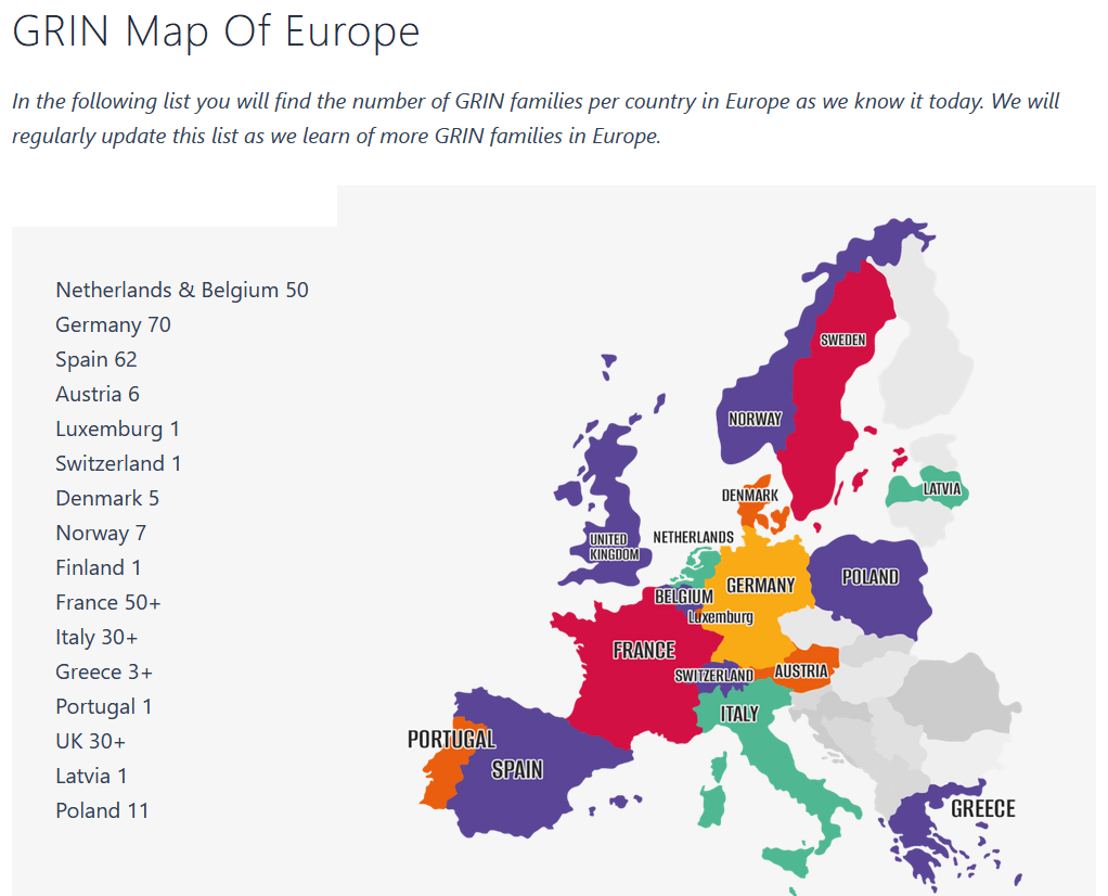 GRIN Europe hat auf seiner Website eine Darstellung, wie viele Familien mit Mitgliedern mit GRIN-assoziierten Erkrankungen in Europa bekannt sind. An den absoluten Zahlen erkennt man schnell, dass in manchen Ländern viel diagnostiziert wird, in anderen wiederum nicht so häufig eine GRIN-Diagnose gestellt wird. Zu bedenken ist, dass es auch immer darauf ankommt, ob Familienangehörige selbst nach „Gleichgesinnten“ suchen oder ob ihnen das kein Anliegen ist. Solange sich Eltern nicht selbst in Datenbanken (wie dem GRIN Portal) eintragen, sind GRIN-Diagnosen auch nirgendwo erfasst.